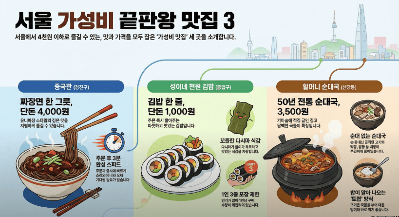 통장잔고0원 세종대 앞 전설의 갓성비 중식당! 석기시대 짜장마을 핵심 요약 가이드 대학가 앞 수많은 가성비 식당 중에서도 단연 돋보이는 갓성비 성지, 석기시대 짜장마을의 방문 포인트를 쏙쏙 뽑아 전해드립니다. 혼밥러들에게 빛과 소금 같은 이곳의 매력을 확인해 보세요. 절대 실패 없는 추천 메뉴 라인업 만 원의 탕수육: 만 원이라는 가격이 무색하게 두툼한 고기와 훌륭한 맛을 자랑합니다. 가성비 중식당에서 흔히 겪는 튀김옷만 두꺼운 탕수육이 아닙니다. 갓성비 식사류: 짜장면 4,000원, 짬뽕과 간짜장이 4,500원입니다. 요즘 배달 중식 물가의 절반도 안 되는 착한 가격으로 푸짐한 한 그릇을 내어줍니다. 혼밥러를 위한 완벽한 환경 워낙 저렴한 가격 덕분에 혼자서 식사 메뉴에 탕수육을 추가해도 부담이 전혀 없습니다. 사장님과 직원분들이 학생들을 대하듯 워낙 살갑고 친절하게 응대해 주셔서, 혼자 방문해도 눈치 보지 않고 아주 편안하게 식사할 수 있습니다. 세련되고 화려한 미식보다는, 학창 시절 학교 앞 식당에서 느끼던 정겨운 온기와 든든함이 그리울 때 강력 추천합니다.